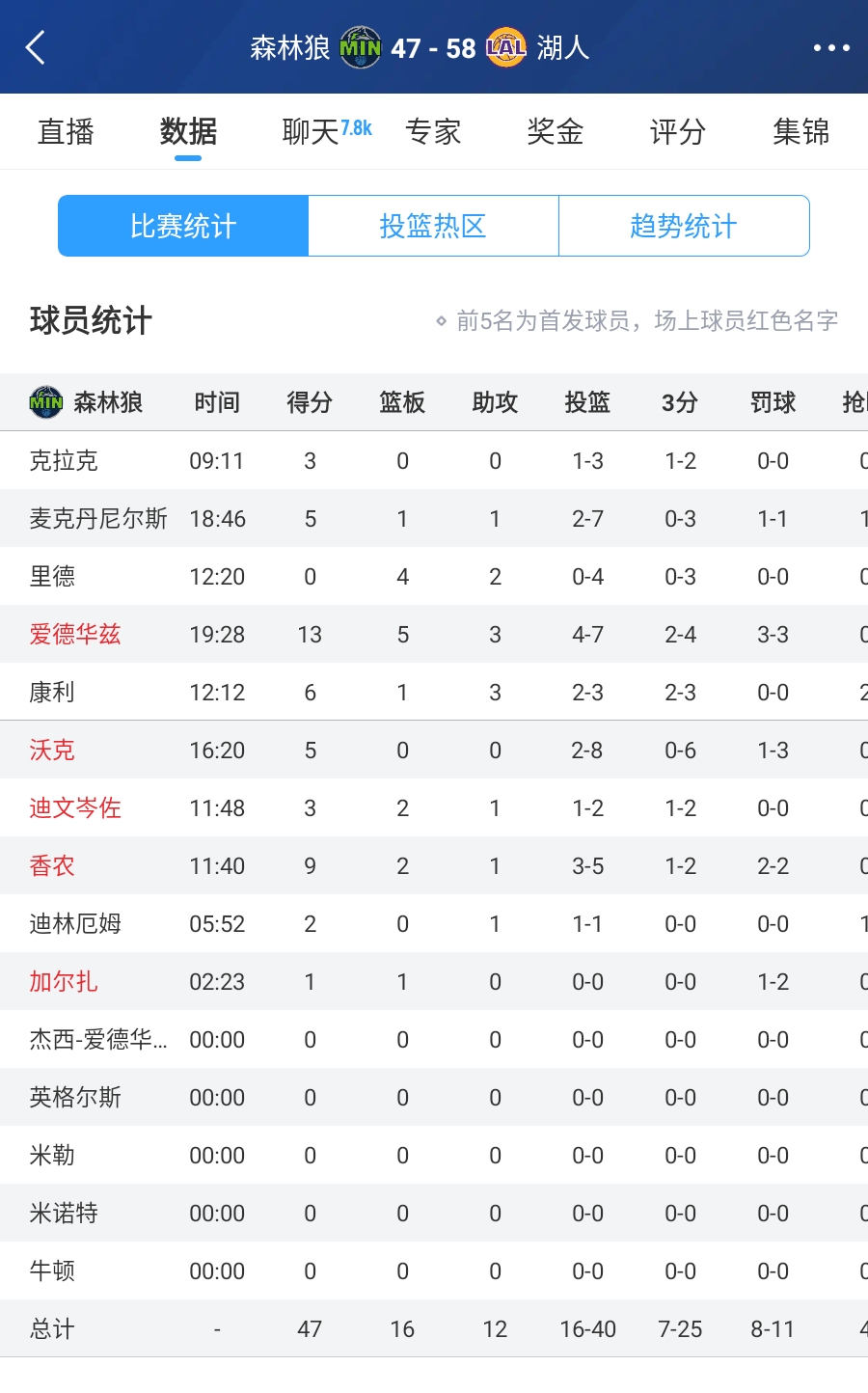 還在找出手時(shí)機!愛(ài)德華茲半場(chǎng)7中4&三分3中2拿到13分5板3助