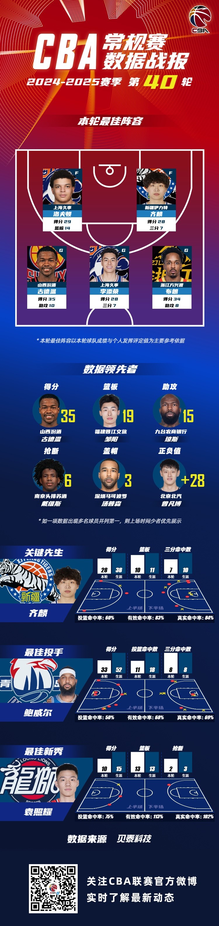2024-2025賽季CBA聯(lián)賽常規賽第40輪結束較量,來(lái)自上海久事大鯊魚(yú)的洛夫頓和李添榮,新疆廣匯籃球俱樂(lè )部的齊麟,山西汾酒職業(yè)籃球俱樂(lè )部的古德溫和浙江廣廈籃球俱樂(lè )部的布朗入選CBA聯(lián)賽常規賽第40輪最佳陣容!