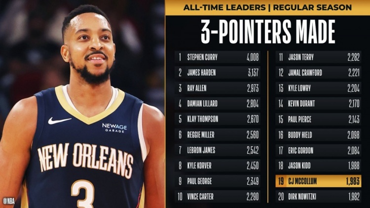 3月20日訊 鵜鶘客場(chǎng)挑戰森林狼,CJ迎來(lái)里程碑。截至發(fā)稿,CJ命中3記三分,生涯三分命中數1983,超越諾維茨基升至NBA歷史第19位。目前排在CJ前面的是基德的1988個(gè)。 標簽: 籃球 NBA 鵜鶘