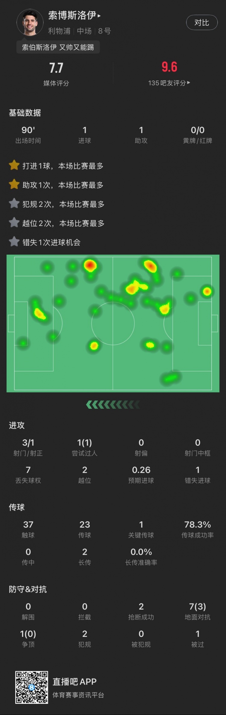 2月24日訊 在剛剛結束的英超本輪焦點(diǎn)戰中,利物浦2-0擊敗曼城。本場(chǎng)比賽,索博斯洛伊傳射建功,獲評7.7分。