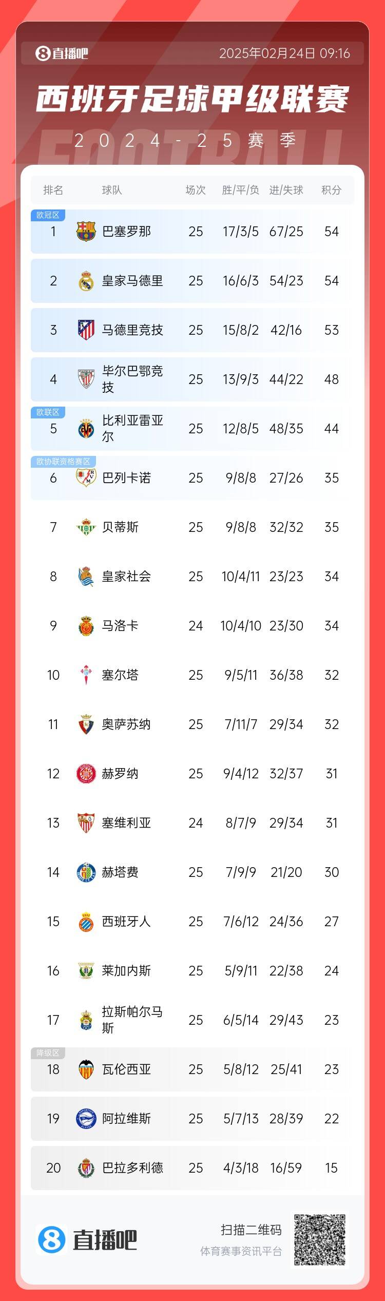 西甲積分榜: