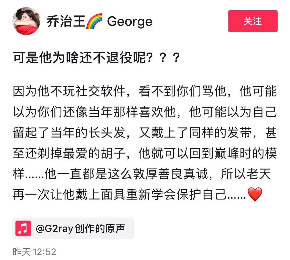 因為他不玩社交軟件,看不到你們罵他,他可能以為你們還像當年那樣喜歡他,他可能以為自己留起了當年的長(cháng)頭發(fā),又戴上了同樣的發(fā)帶,甚至還剃掉最?lèi)?ài)的胡子,他就可以回到巔峰時(shí)的模樣…… 他一直都是這么敦厚善良真誠,所以老天再一次讓他戴上面具重新學(xué)會(huì )保護自己……?