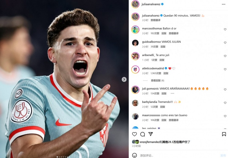 本場(chǎng)比賽阿爾瓦雷斯一傳一射表現出色,賽后他也在個(gè)人社媒曬出本場(chǎng)慶祝進(jìn)球的照片,配文寫(xiě)道:“還有90分鐘比賽,我們繼續加油!”