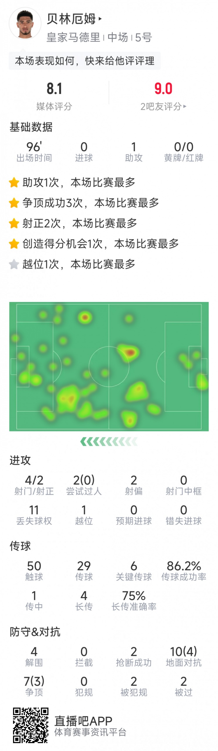 2月27日訊 在國王杯半決賽,皇馬1-0擊敗皇家社會(huì ),,貝林厄姆送出助攻,以下為他在本場(chǎng)數據: