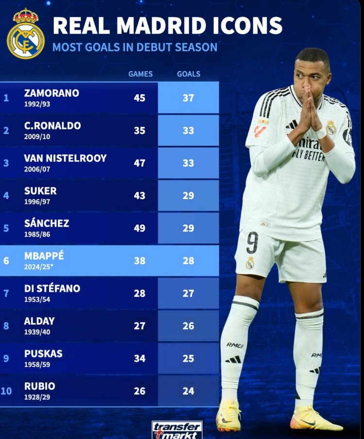 2月27日訊 姆巴佩在皇馬效力的首個(gè)賽季目前各項賽事已經(jīng)打進(jìn)28球,距離皇馬隊史首秀賽季進(jìn)球數紀錄還有9球,以下為具體榜單: