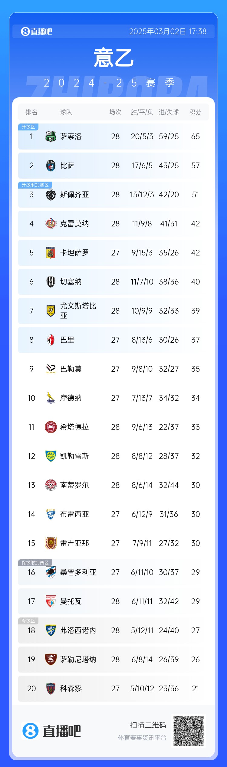 本輪意乙焦點(diǎn)戰,法比奧·格羅索執教的薩索洛1:0擊敗菲利普·因扎吉執教的比薩,繼續穩居積分榜首位,領(lǐng)先第三名14分,重返意甲或許只是時(shí)間問(wèn)題。比薩雖然輸球,但仍居第二位,領(lǐng)先第三名6分。