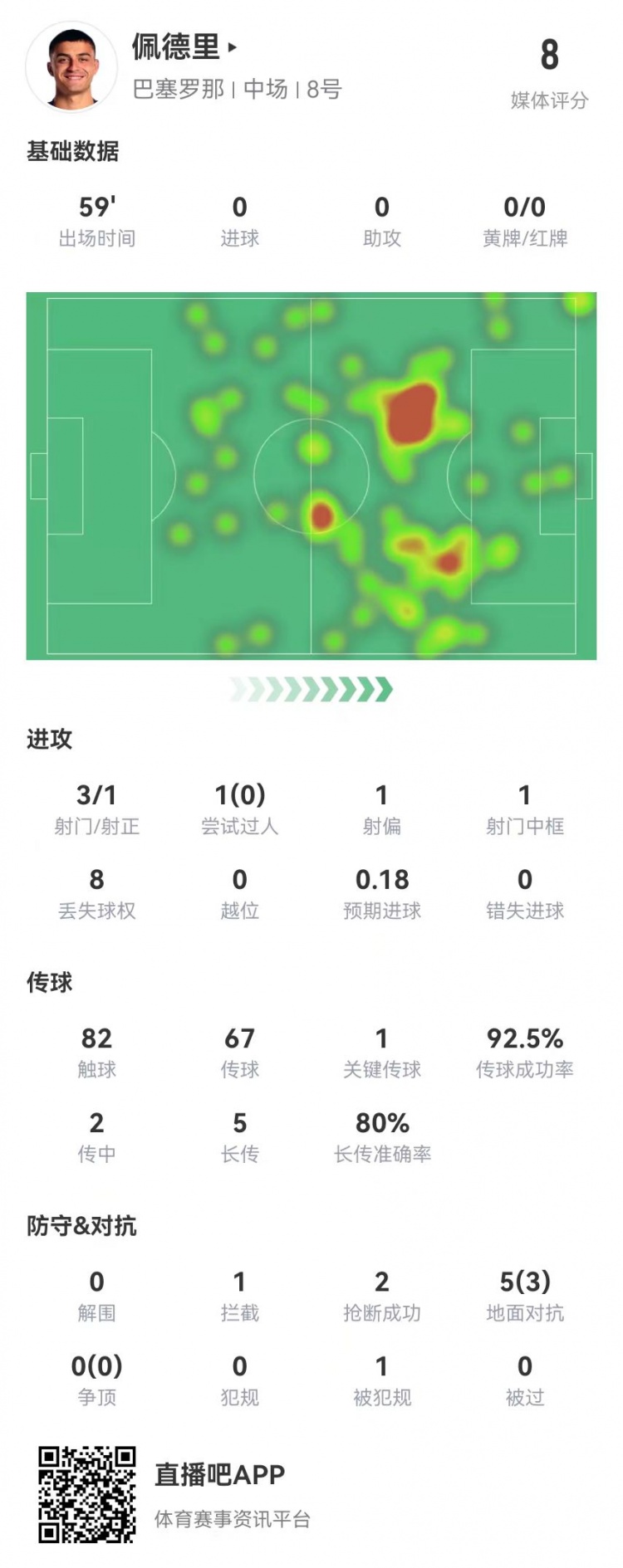 3月3日訊 巴薩在本輪西甲4-0領(lǐng)先皇社,佩德里本場(chǎng)數據如下: