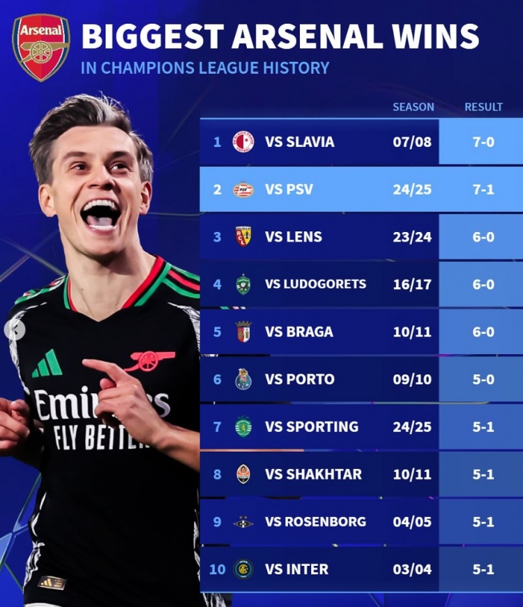 3月5日訊 歐冠16強戰首回合比賽已經(jīng)先賽4場(chǎng),阿森納作客7-1痛擊埃因霍溫?!掇D會(huì )市場(chǎng)》也列出了阿森納隊史歐冠單場(chǎng)最大比分勝利情況。