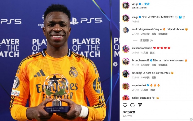 2月12日訊 皇馬在本輪歐冠客場(chǎng)3-2逆轉曼城,維尼修斯表現搶眼并當選全場(chǎng)最佳球員。
